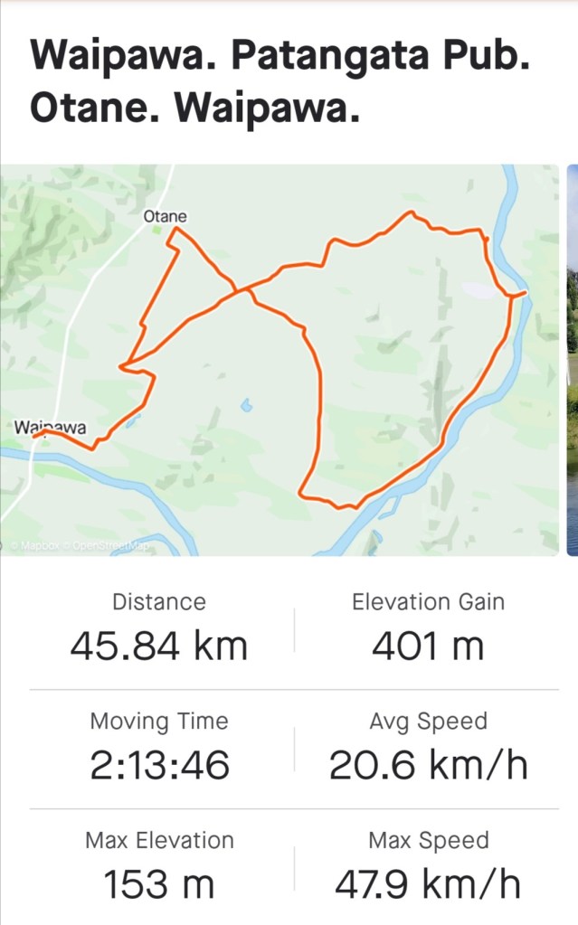 The destination for this loop is to the well-known Patangata Tavern. The route from Waipawa is along quiet, undulating country roads. The scenery is gorgeous, especially at this time of year (early spring). The glimpses of the Tukituki River are magic. Make sure that your battery is fully charged to cope with the uphills and any head-winds. Est. Distance: 41kms