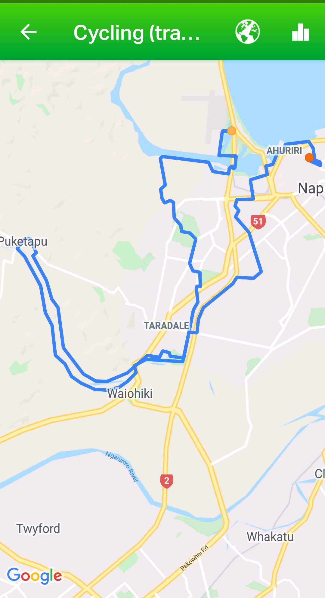 Long Ride : Car Park Ahuriri – Coastal Pathway to Domain Rd – Watchman Rd to Airport – Westshore Bridges – Lower Water Ride – Park Island – Westminster Rd – Anderson Park – Greenmeadows – Burness Rd – Meeanee Rd – Taradale Rugby Grounds – Pettigrew Arena – Puketapu via the northern trail..