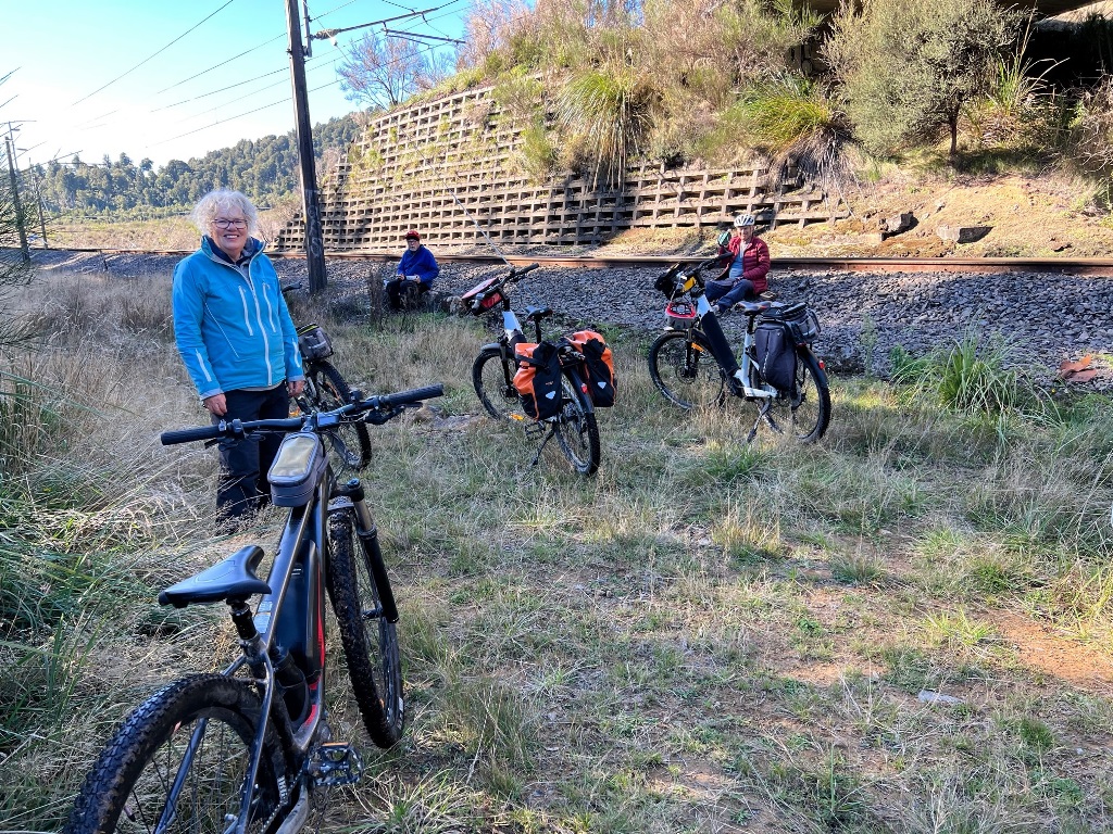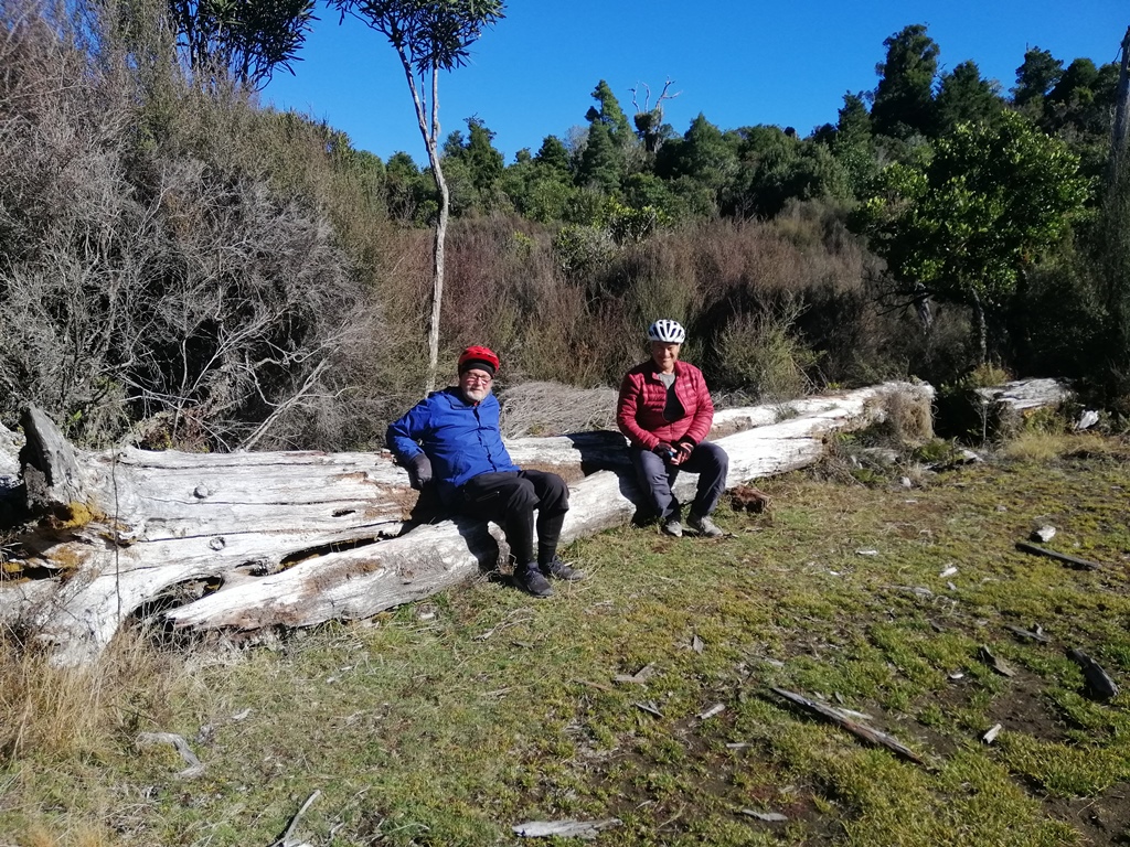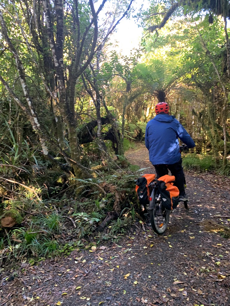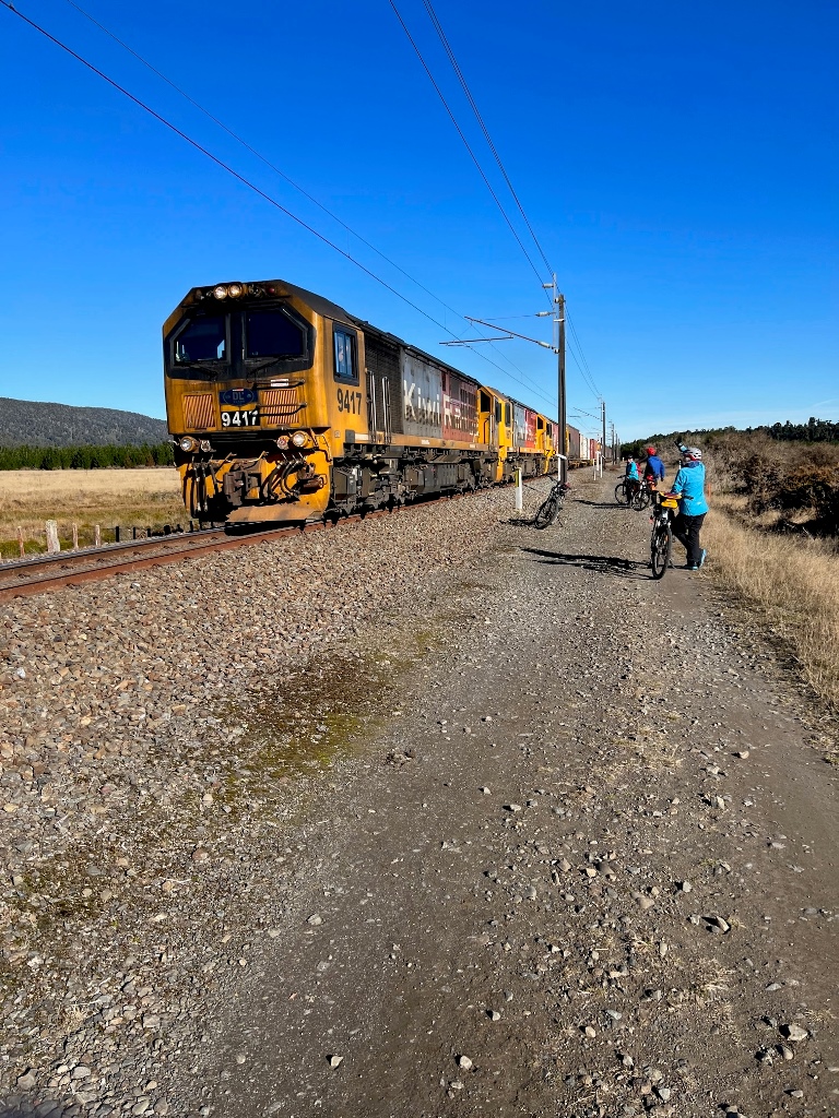 The Marton Sash and Doors trail (Grade 3, approx. 22kms) begins at National Park Rail Station. It is a varied loop track, stretches of flat trails, a short sharp (with corners) climb up to the forest, and a tram trail. The trail surface ranges from gravel/shingle, railway ballast, buried sleepers and pine forest floor with tree roots. It is bumpy. The landscape changes from alpine volcanic to the beautiful New Zealand Bush to pine forest.