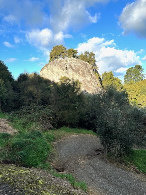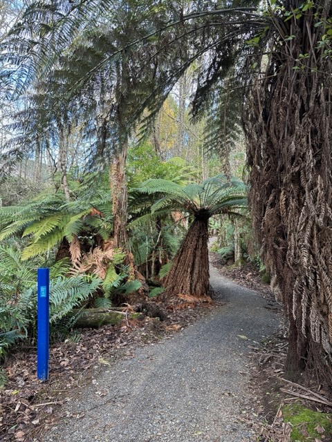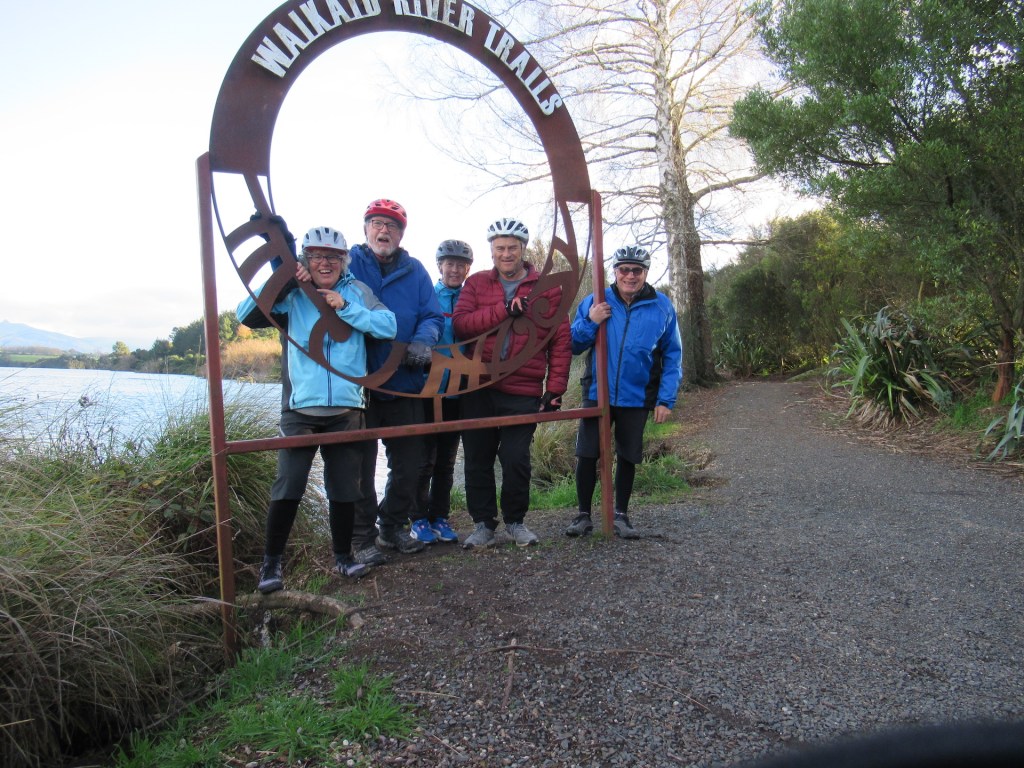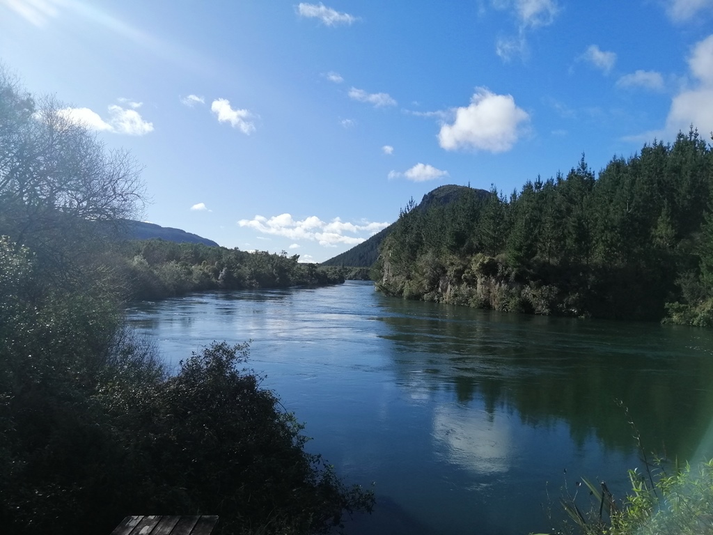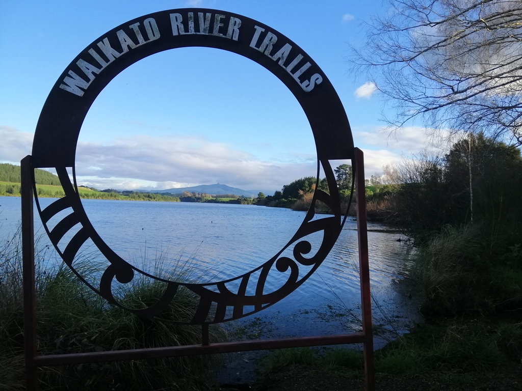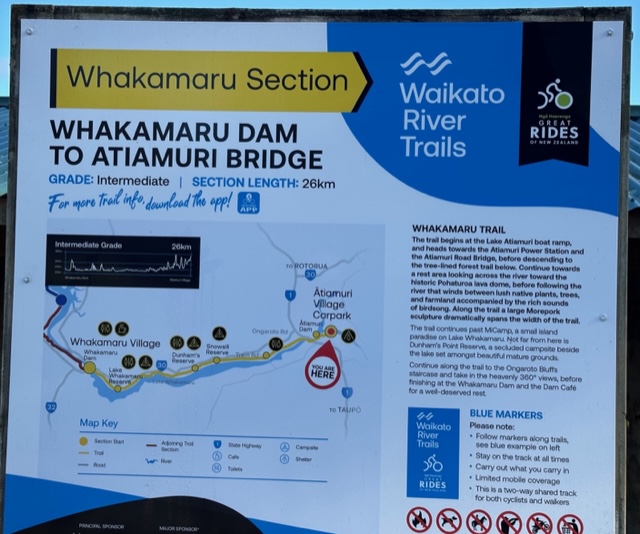 These two sections (#5 Whakamaru and #4 Maraetai) of the Waikato River Trails are more suited to young/fit/mountain bikers. I fit none of those categories and I found it very challenging. The trail follows the Waikato River, along high cliffs and back down to river level. It passes through fields, native bush, pine forests and beside dams and power stations. The trail surface has been well maintained with fresh metal in place for our visit. The gradient varies between flat boardwalks, to steep inclines and sharp corners. It is well signposted by blue markers. Distance 44.5kms. We rode the new 5kms section from Ohakuri Road to Atiamuri Village Carpark.