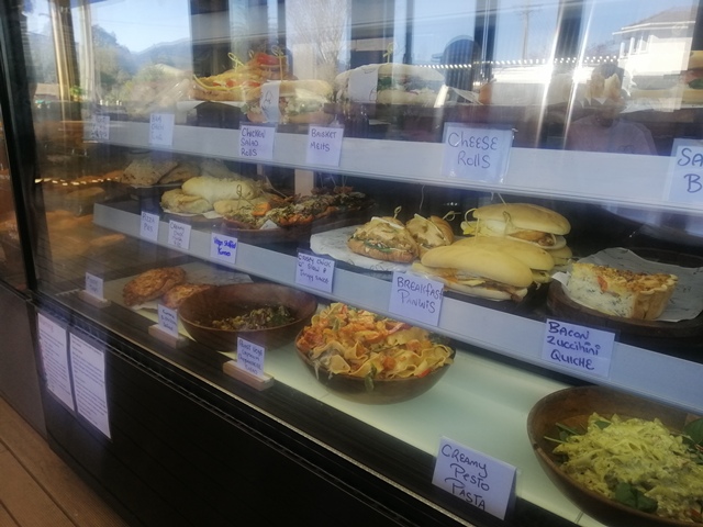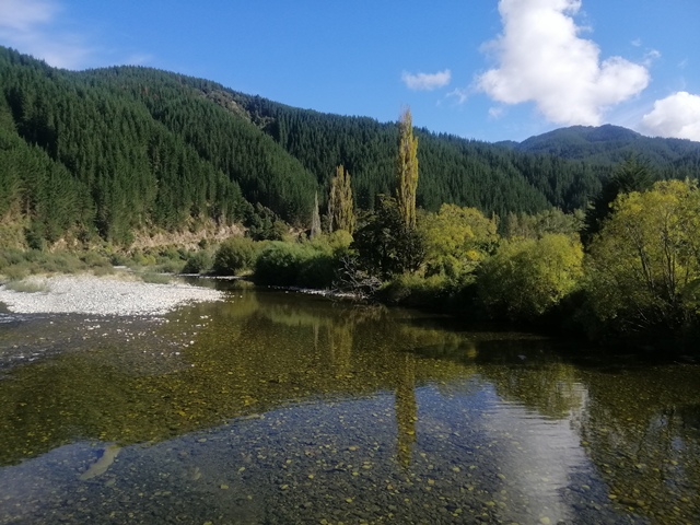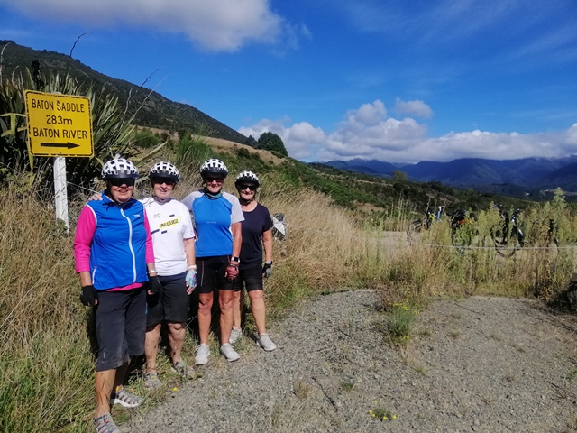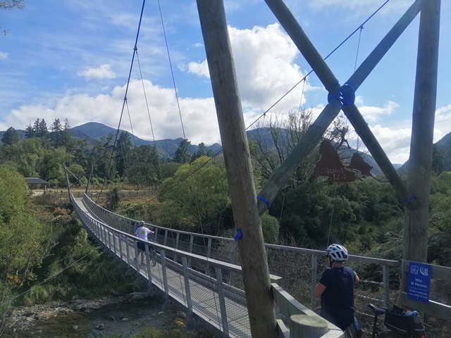 We set off eagerly on a big day’s ride. The Trail is well signposted, but we did make a blooper at an unclear spot by turning off into Drummonds Road. It was a private road. A bridge over the river provided beautiful views, and the thought of trout in the river. Fortunately, it didn’t take long to realise our error and we continued on through beautiful valleys and over the undulating trail. Our high point was at Baton Saddle – 283 metres. We had been advised to reach our lunch spot by 1pm but we arrived late. We were very hungry. And very pleased that the host at River Haven was happy to serve us our lunch. I treated myself to a cider from the tap. The server stayed to check that I liked it. It was just like the scrumpy I used to drink in the UK. It was very good. It’s a lovely spot and we lingered.