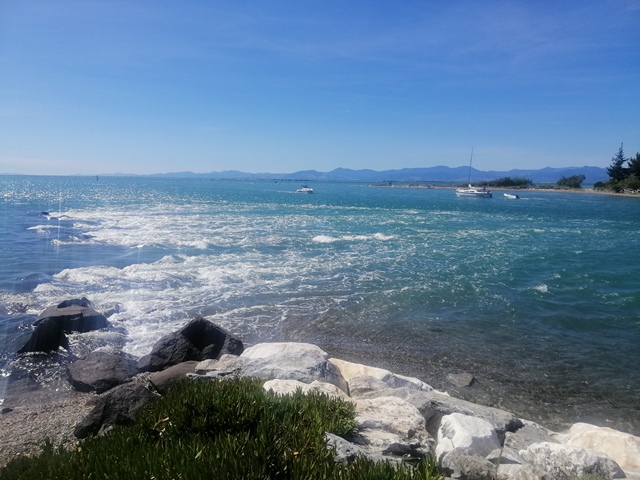 We didn’t really want to leave our wonderful accommodation. But after a healthy and tasty breakfast we “flew” down the driveway and got back on the trail. We stopped for a coffee at Mrs Smith’s Café at Riwaka and resisted the delicious cabinet food on display. We were now on the coastal part of the Trail. We omitted going through the bike park at the start because it was a Sunday, and we expected that there would have been quite a lot of young people out and about. So, we braved the steep road out of Kaiteriteri, and it was OK. We rode through a bird sanctuary, stopped to view the wreck of the Janie Seddon and took a wrong turn which took us to a port entrance where the tide was flowing in at an extremely fast rate. It was fascinating to watch. We climbed up a hill though a forestry area. The trail here seemed quite new, and it will be great once it settles in. Note: When on the approach to Mapua, look out for the left turn into Tait Street to avoid the main road, and enjoy the coastal path. We arrived at Mapua early afternoon. We looked around the Sunday Markets before we headed to our accommodation. And we were blown away by our accommodation. It was a flash 3-bedroom apartment house with the deck right next to the estuary. Absolute luxury! Mapua Wharfside Apartments. We decided to buy fish and chips for our lunch and eat it at the apartment. I thought I’d ordered 2 pieces of fish and was given 5 pieces. Perhaps it was two servings rather than two pieces! It was so fresh and delicious I ate them all, and then I had no appetite for dinner! It was lovely wandering around the gift shops and art galleries at Mapua.